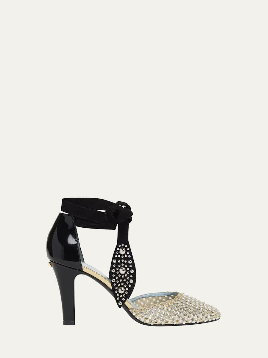 Valentino Garavani crystalembellished mesh pumps 3.25 in / 85 mm stiletto heel Point toe Suede ankle strap with foliage tips Leather lining and outsole Trim: Metal Made in Italy