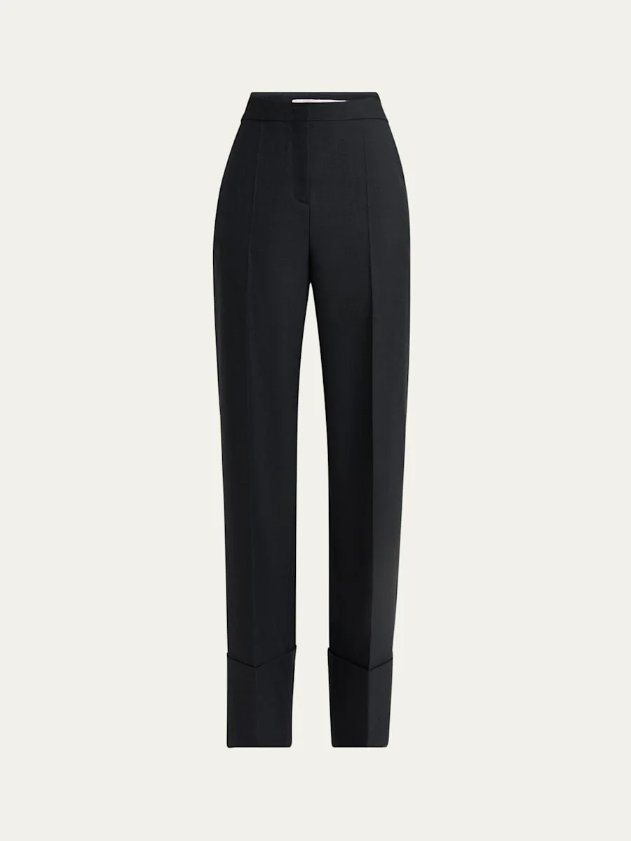 Valentino Garavani cuffed trousers Full length High rise Straight legs Side slip pockets; back welt pockets Tab/zip fly Virgin wool Cotton lining Made in Italy Online Inquiries: BGS21_B9SP0| Store Inquiries: #4957854