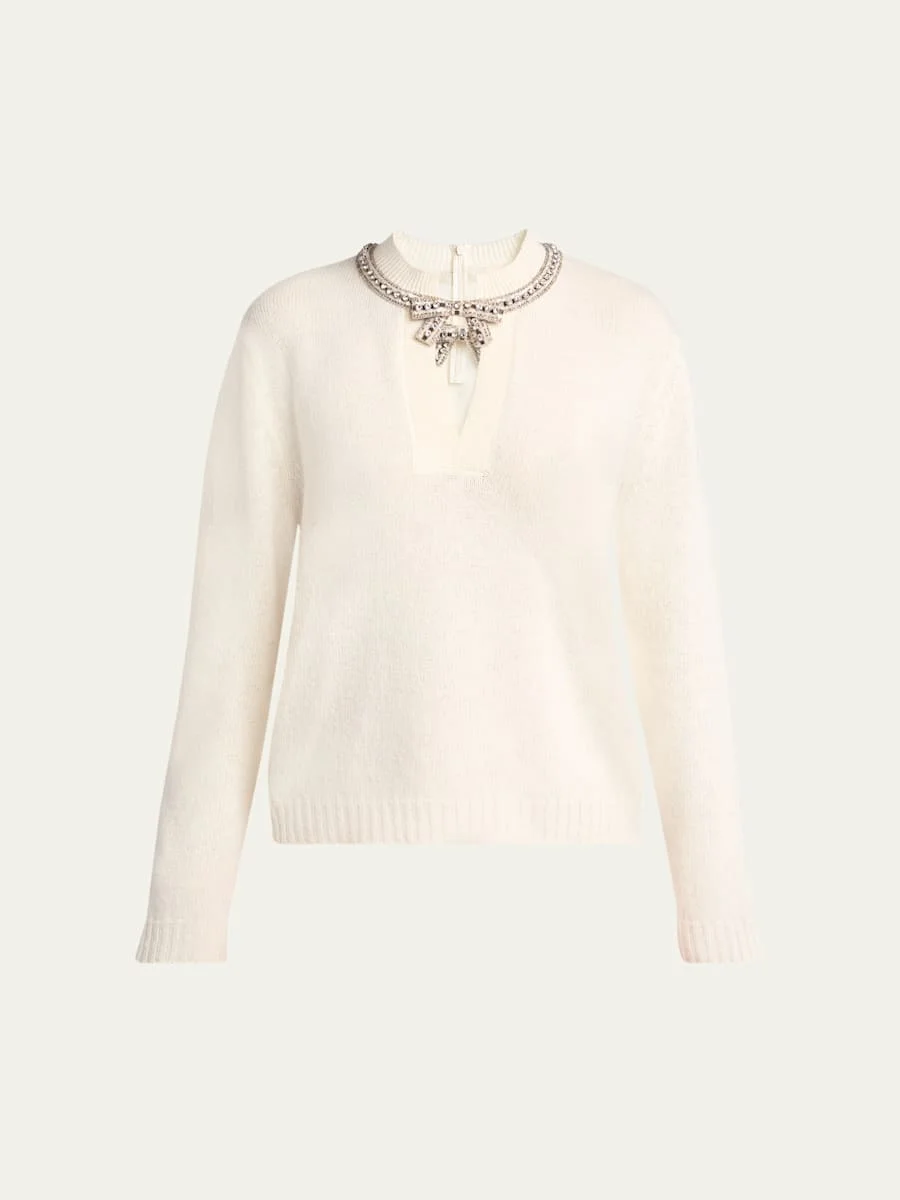 Valentino Garavani sweater features a crystal bow embroidered neckline with a front keyhole detail Crew neckline; front keyhole Long sleeves Loose fit Ribbed cuffs and hem Invisible back zip Polyester Made in Italy