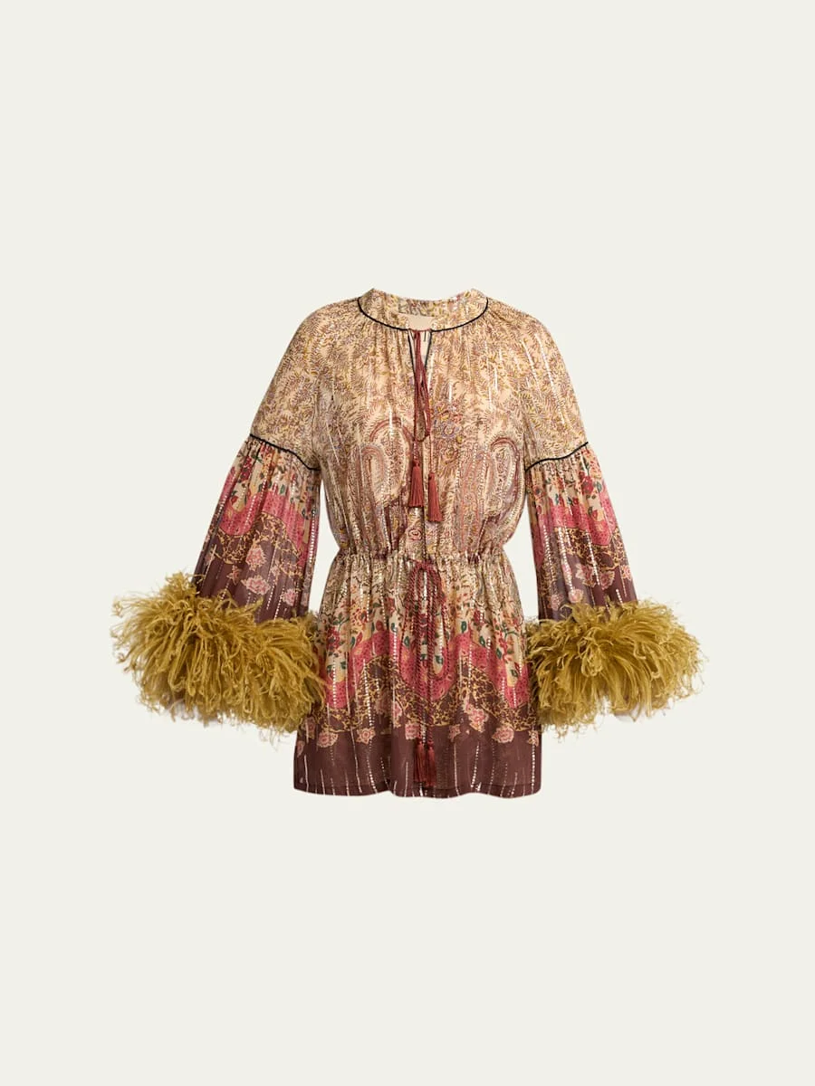 Flare-Sleeve Metallic Paisley Silk Top With Feather Trim
