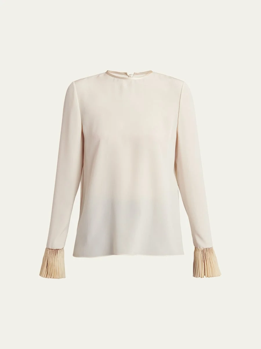 This Valentino Garavani shirt is matte and smooth, detailed with lustrous satin trim along the neckline and fluttering accents on the cuffs Crew neckline Long sleeves Relaxed fit Keyhole button back Pullover style Silk/nylon/polyamide Made in Italy