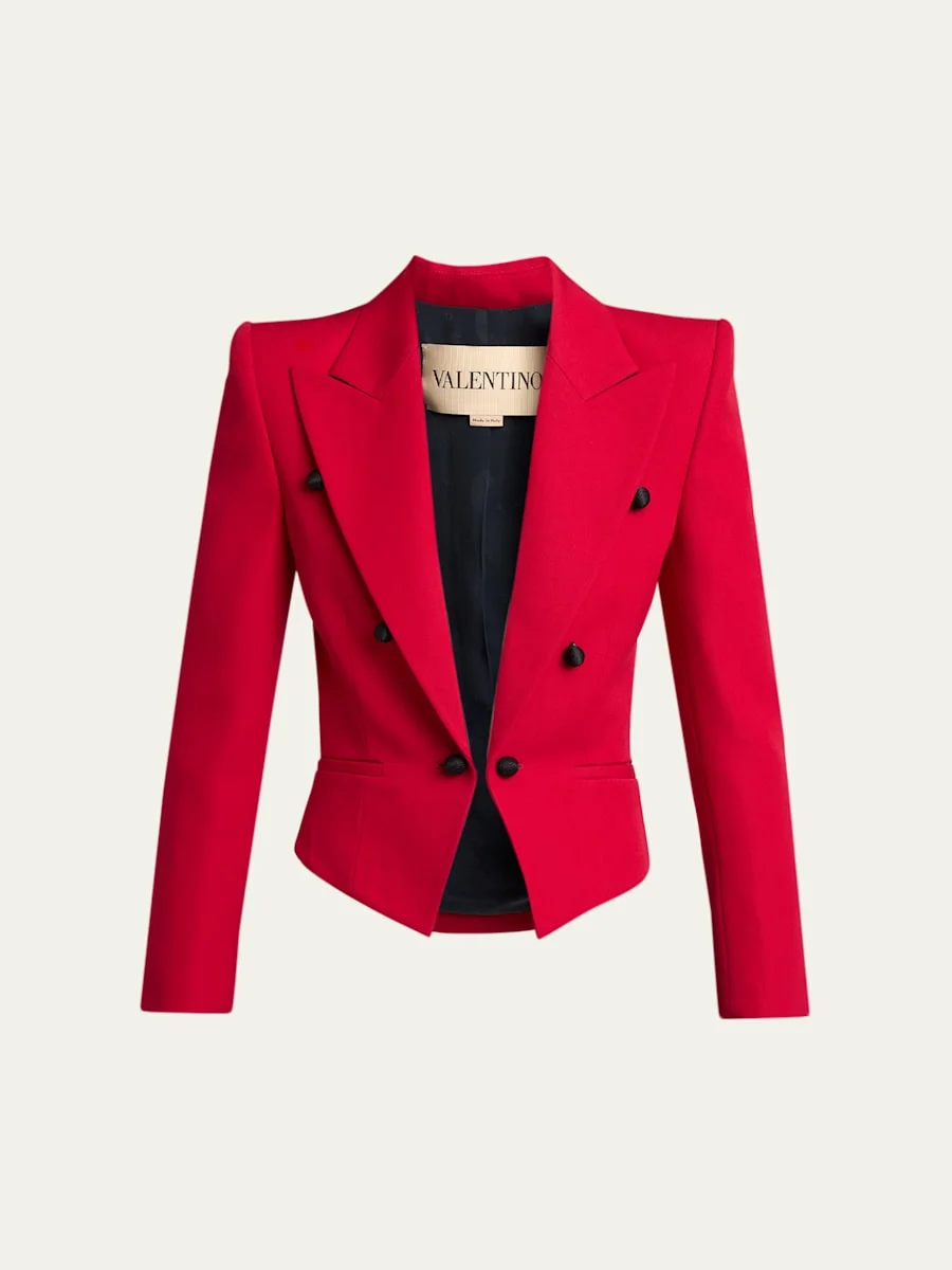 Tailored from solid wool, the "Giacca" blazer from Valentino Garavani features structured shoulders and contrasting decorative buttons Peak lapels Padded shoulders Long sleeves; button cuffs Front welt pockets Fitted Hip length Virgin wool Made in Italy