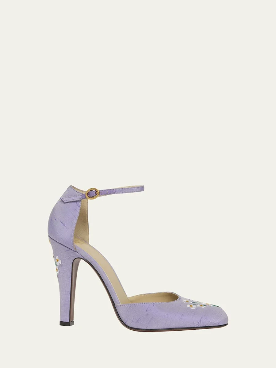Valentino Garavani "Hi Dolly" satin silk pumps with embroidered daisy flowers 4.25 in / 105 mm stiletto heel Round toe Adjustable ankle strap Leather outsole Lining: Leather Made in Italy Size Note: Valentino Garavani shoes run small. Please order a 1/2 size larger than you typically wear. Online Inquiries: BGS21_X6VLP| Store Inquiries: #4994771