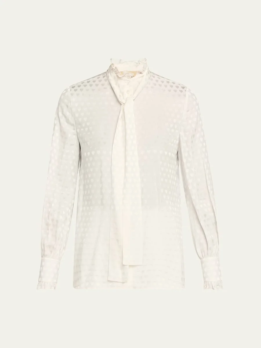 Valentino Garavani blouse with allover shimmer hearts and motherofpearl buttons Includes matching removable neck selftie High collar; button front Long sleeves; button cuffs Ruched back yoke Relaxed fit Silk/motherofpearl Made in Italy