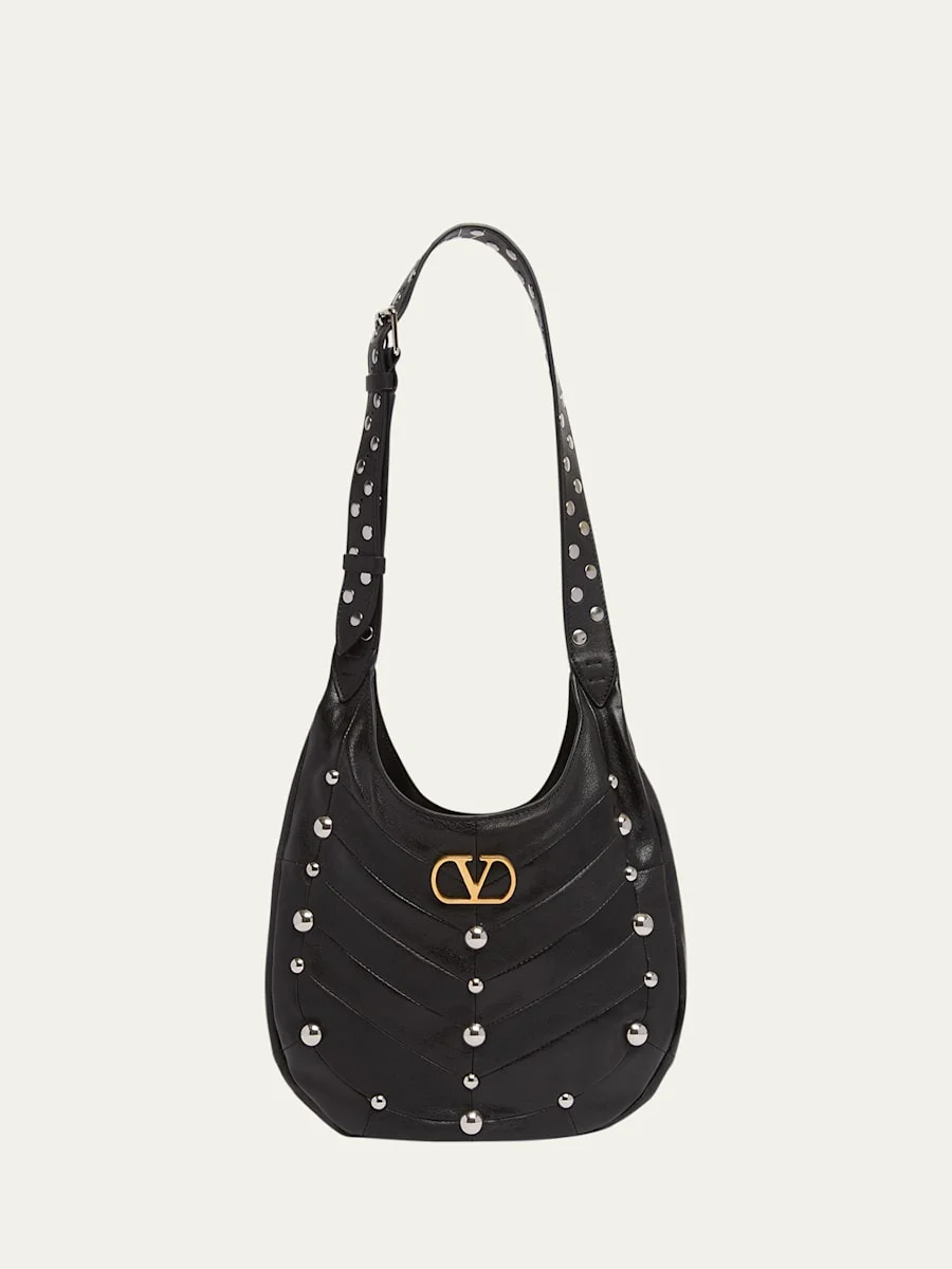 Valentino Garavani "Hoboho" small hobo bag crafted from smooth Nappa leather, adorned with a chevron pattern and silvertone studs. Features signature VLogo hardware Adjustable shoulder strap; 13.4" drop Includes an additional crossbody strap Interior, one slip pocket Leather lining Approx. 8.5"H x 11"W x 1.2"D Made in Italy