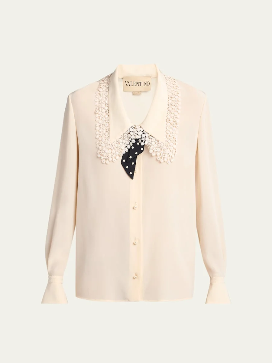 Lace-Trim Button-Down Silk Blouse With Polkadot Tie