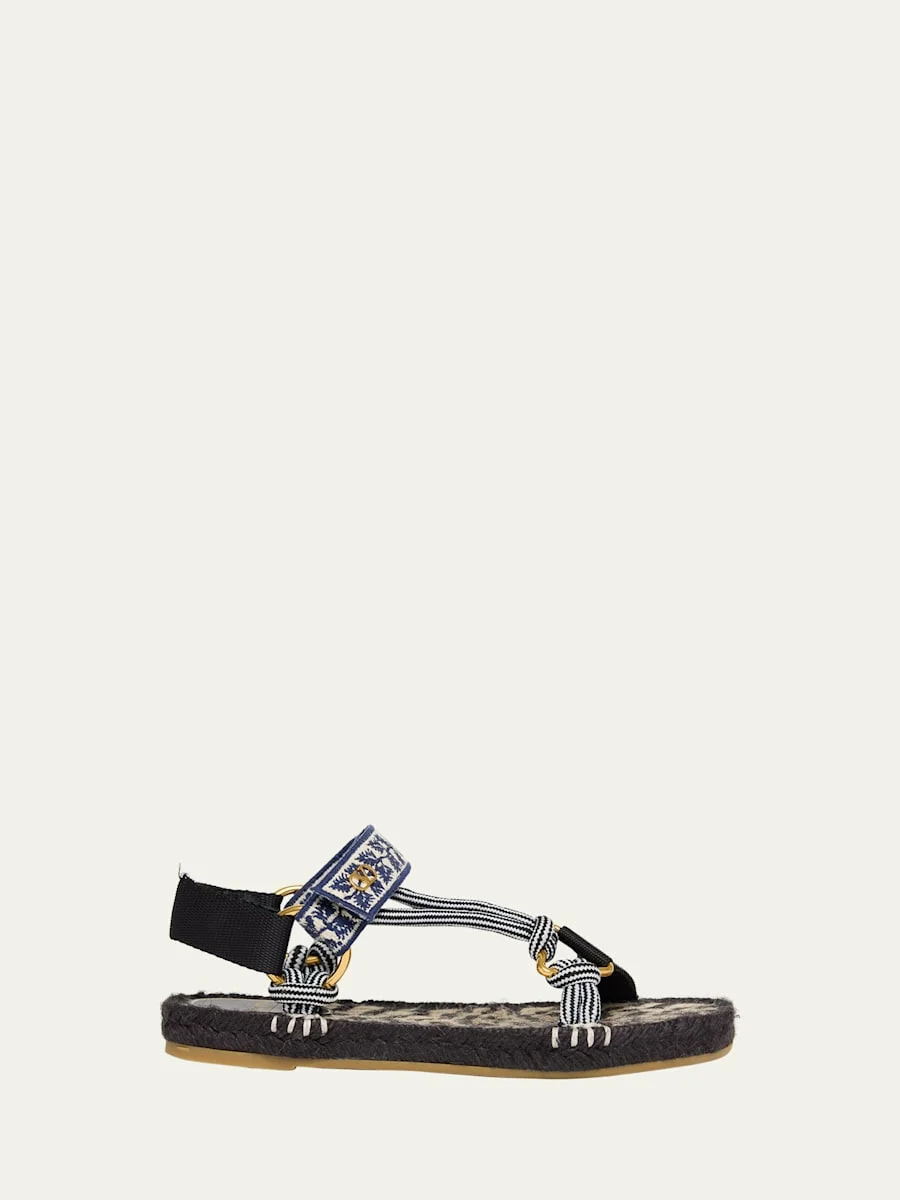 Valentino Garavani nylon/polyamide sporty espadrille sandals. 0.75 in / 20 mm flat braided jute heel. Open toe. Asymmetrical Tstrap vamp. Adjustable grip ankle strap. Slingback grip strap. Jute lining. Leather sole. Made in Italy.