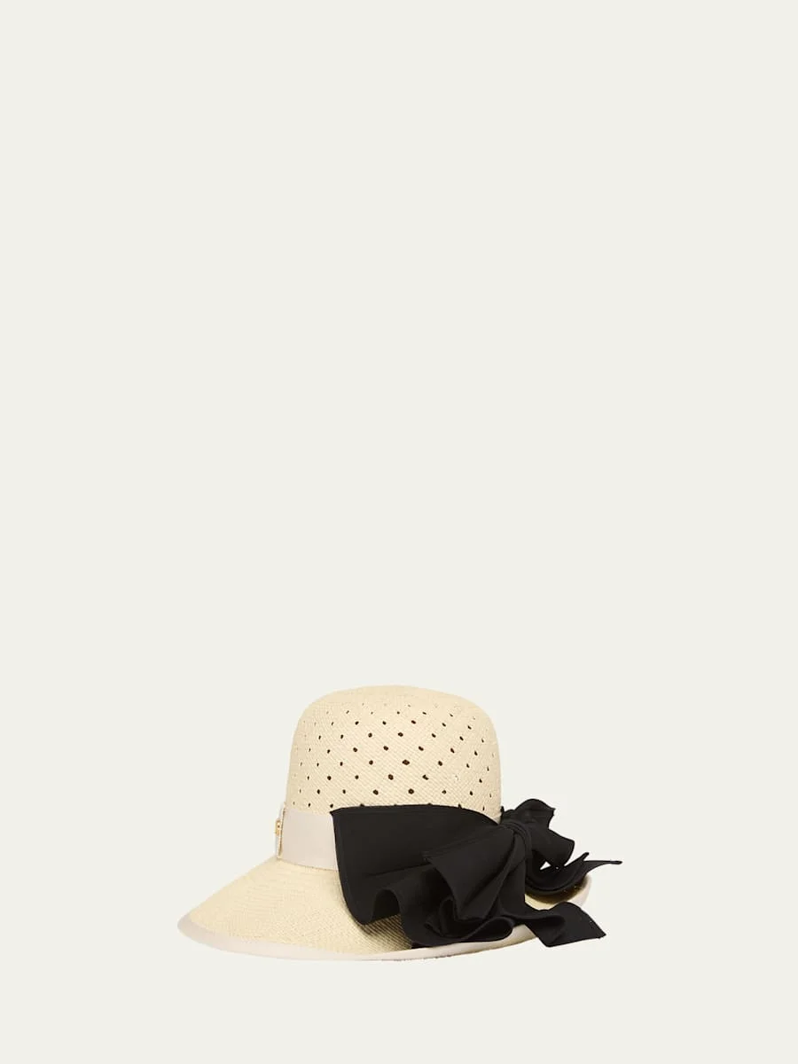 Valentino hat with a large brim and contrast bow accent Features signature V-logo Round crown Band at break Virgin wool/silk/leather Made in Italy Online Inquiries: BGS21_D56RN| Store Inquiries: #4998959