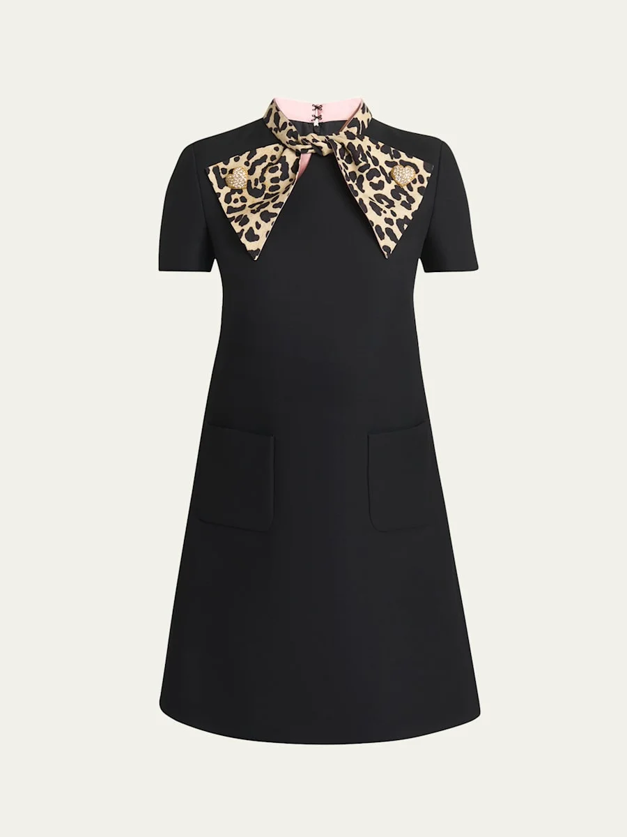Valentino Garavani crepe Couture dress is adorned with a statement leopard bow and heart-shaped crystal-embellished charms Mock neckline Short sleeves Hem falls above the knee A-line silhouette Back zip Virgin wool/silk Made in Italy Online Inquiries: BGS21_B9XT1| Store Inquiries: #4996666
