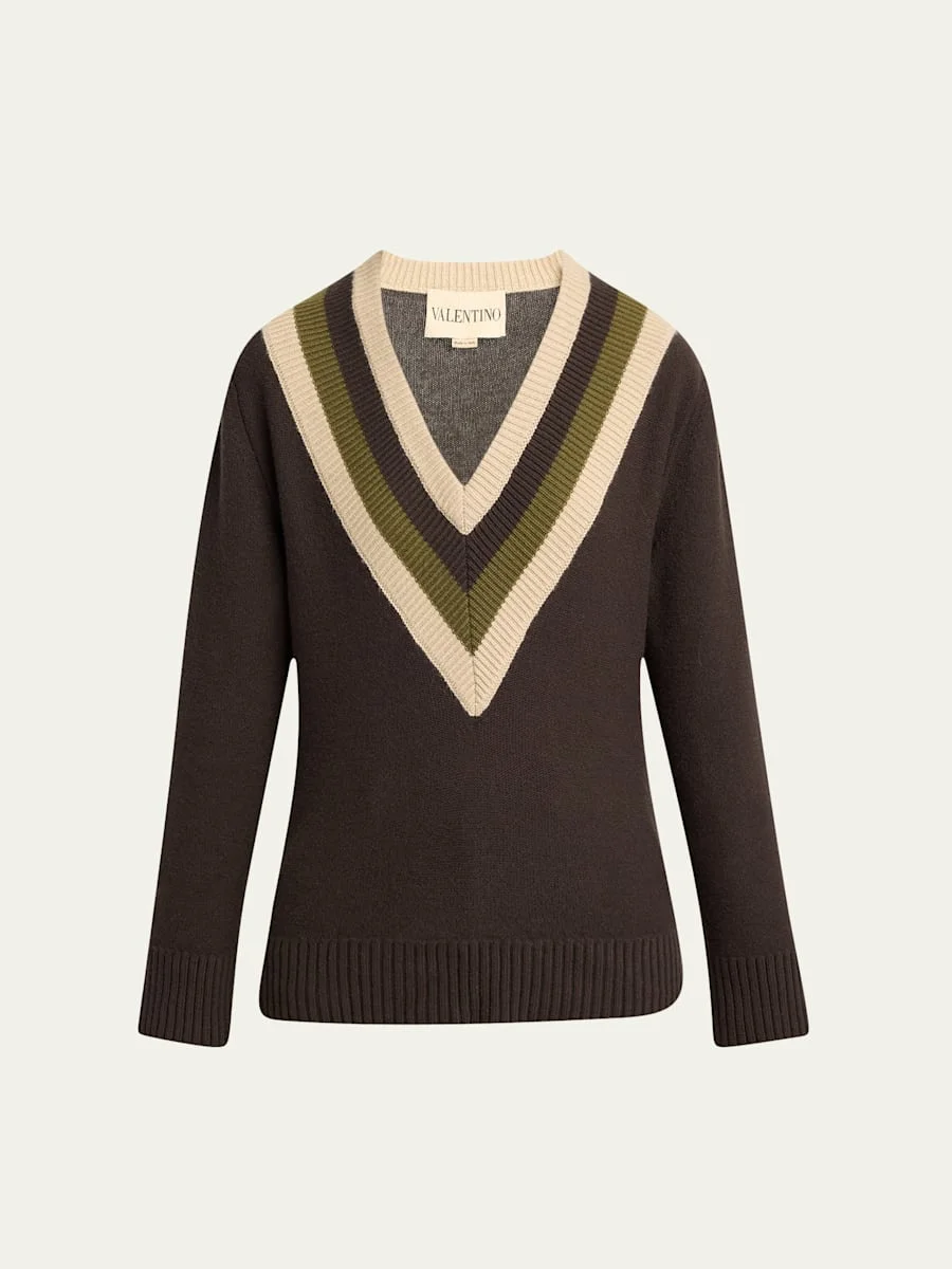 Knit from pure wool, the "Maglia" sweater by Valentino Garavani features a multi-striped neck-outlining design V neckline Long sleeves Classic fit Hip length Ribbed cuffs and hem Pullover style Virgin wool Made in Italy Online Inquiries: BGS21_BAKX7| Store Inquiries: #5180327