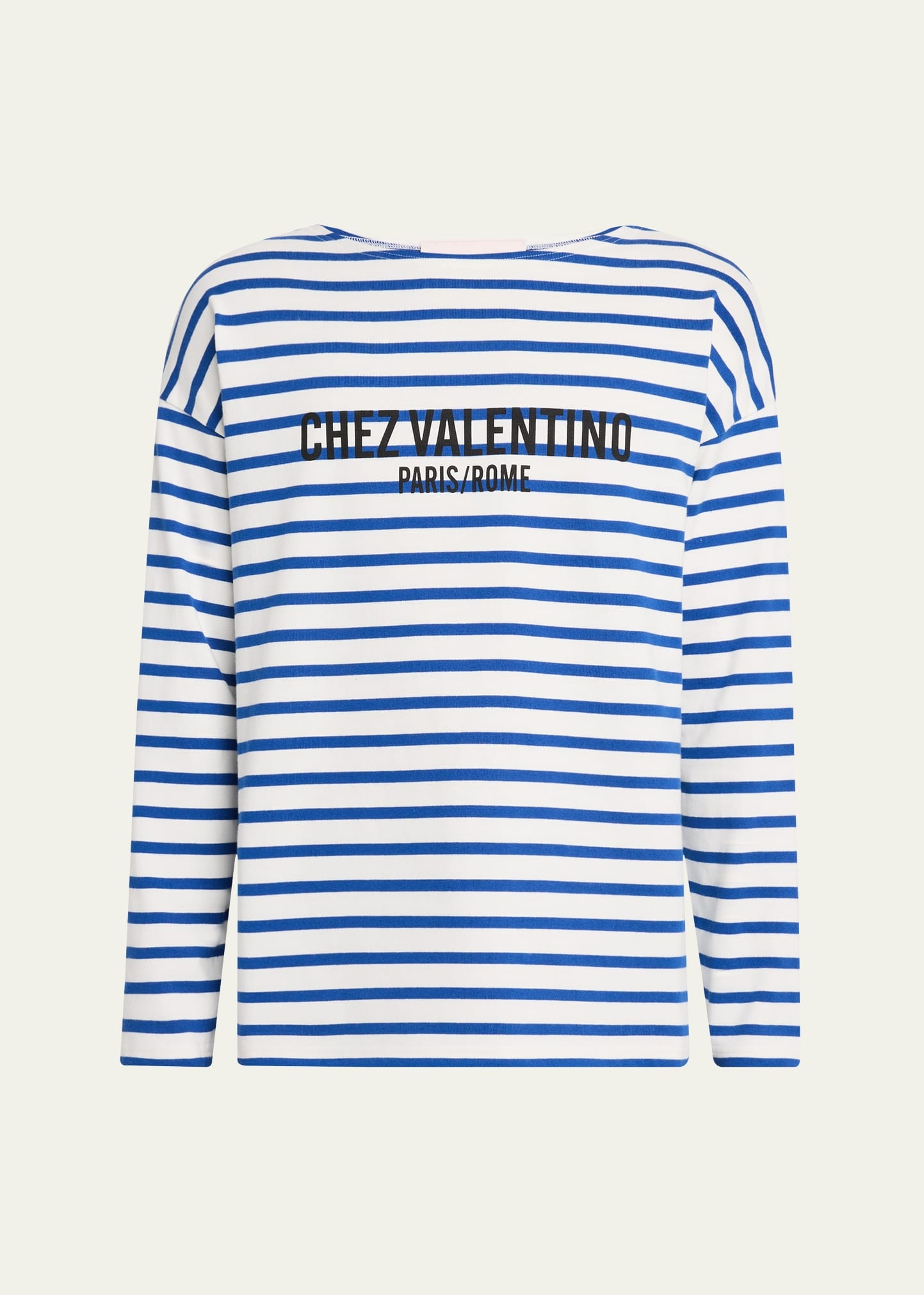 Valentino Garavani jersey T-shirt in sailor stripes "Chez Valentino" logo print on front Round neckline Dropped shoulders Long sleeves Relaxed fit Pullover style Cotton Made in Italy Online Inquiries: BGS21_NCJ0M| Store Inquiries: #4888996