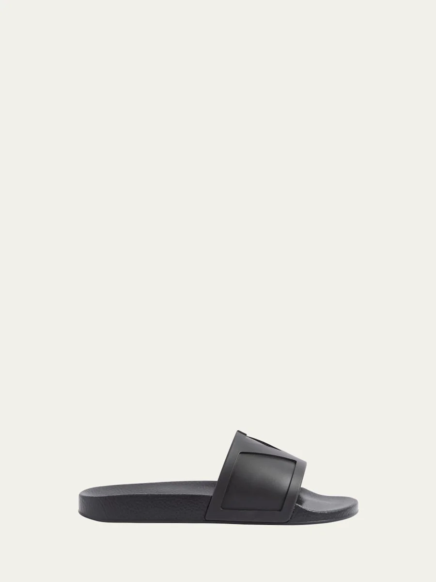 Valentino Garavani "Coolslide" slide sandals in plastic Wide band vamp with embossed VLogo Flat heel Open toe Molded footbed Easy slide style Leather lining and sole Made in Italy Online Inquiries: BGS21_NEVEV| Store Inquiries: #4885729