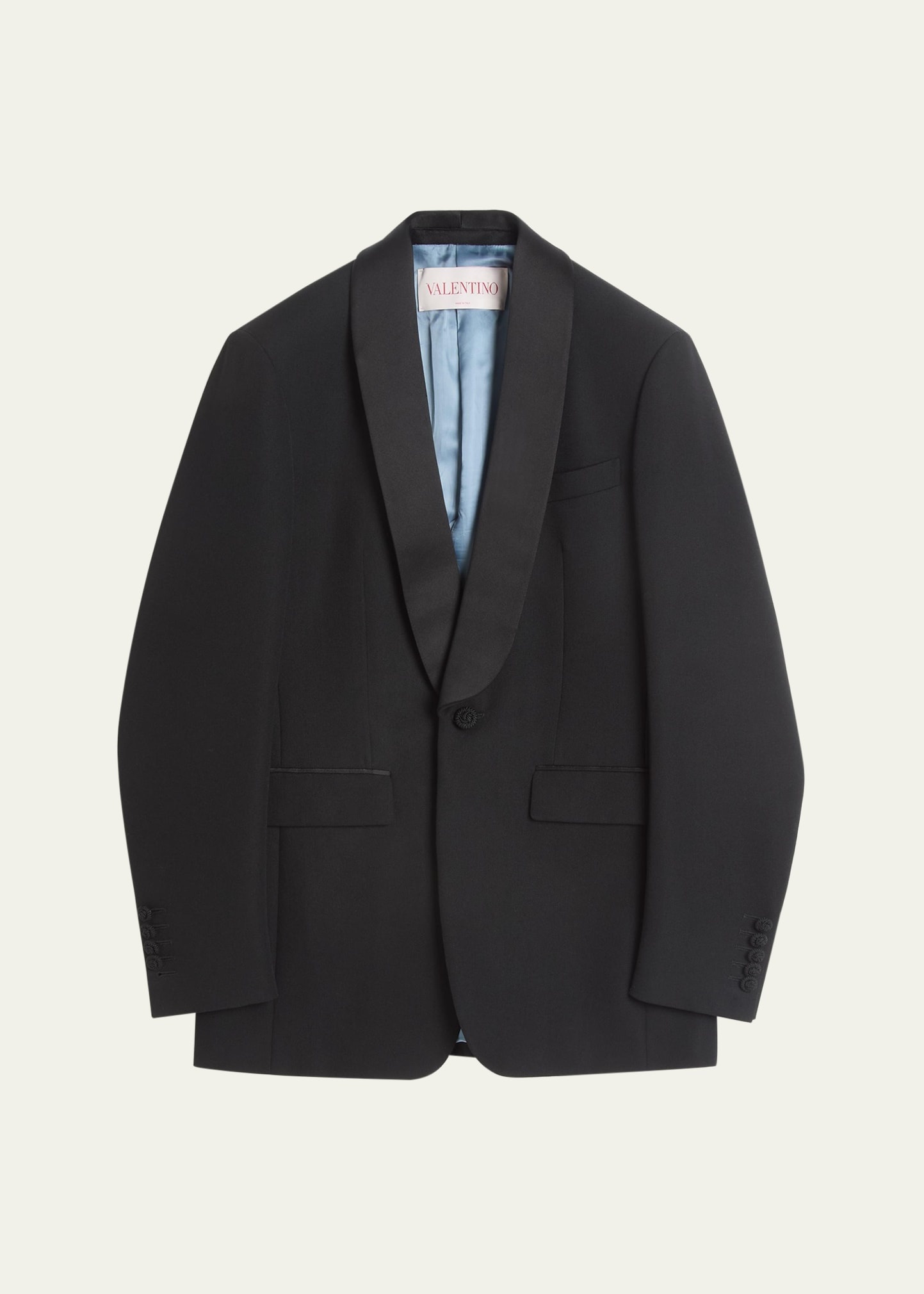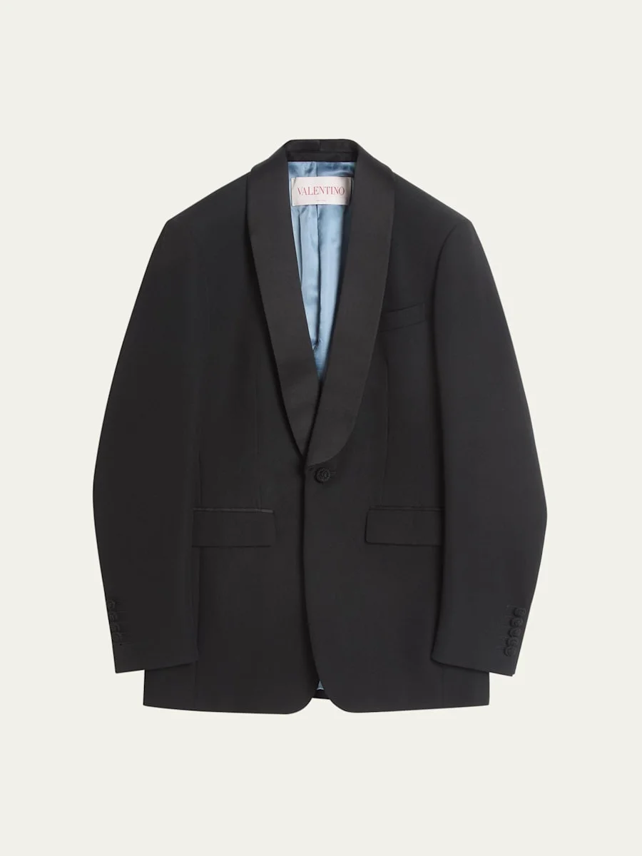 Valentino Garavani solid grain de poudre sport coat Shawl lapels Single-button closure Chest welt pocket Hip flap pockets Five-button sleeve finish Center back vent Cupro Made in Italy Model is 6'1"/185cm. Online Inquiries: BGS21_NCHXU| Store Inquiries: #4888663