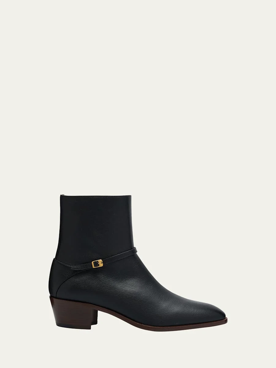 Valentino Garavani booties in leather Block heel Almond toe Leather strap with gold-tone buckle Goat leather lining Side zip for easy on and off Made in Italy Online Inquiries: BGS21_NCHHH| Store Inquiries: #4885716