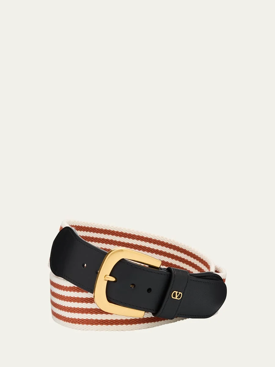 Valentino Garavani belt in cotton and polyester with nano-stripes Approx. 1.57"W Leather trim Gold-tone buckle Leather loop with VLogo Adjustable fit Cotton/polyester/leather Made in Italy Online Inquiries: BGS21_NCHPB| Store Inquiries: #4886643