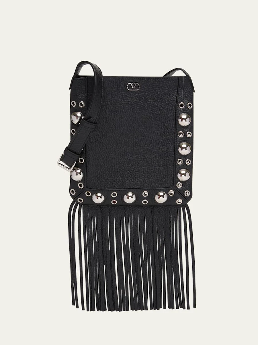 Valentino Garavani "Nellcote" small crossbody bag in grained leather Trim decorated with ball studs, rivets and long leather fringe VLogo hardware on the front Adjustable shoulder strap Open top Approx. 7.9"H x 7.9"W x 1.18"D Made in Italy Online Inquiries: BGS21_ND1VK| Store Inquiries: #4998221