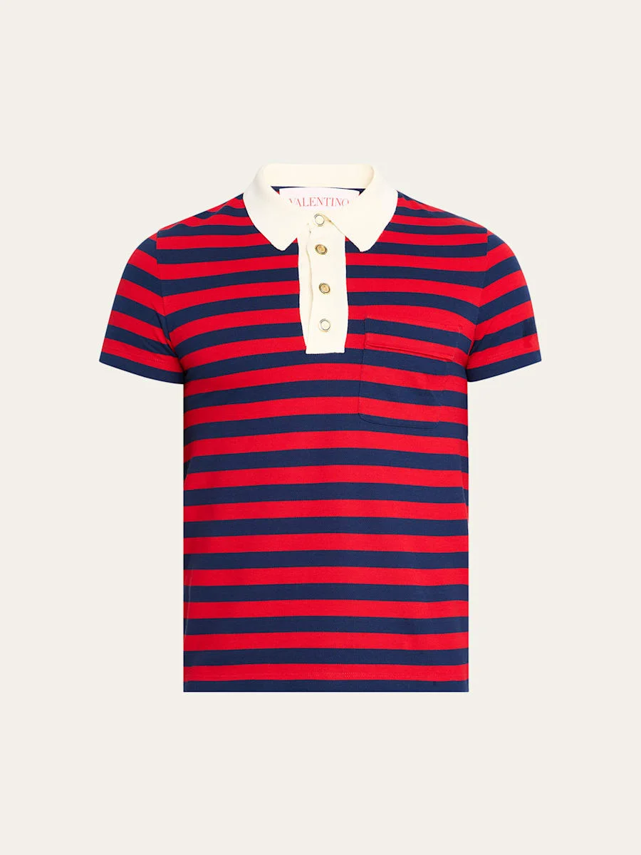 Valentino Garavani polo shirt in stripe cotton pique Contast spread collar and four-button placket Chest patch pocket Short sleeves Pullover style Slim fit Cotton Made in Italy Online Inquiries: BGS21_NCHY3| Store Inquiries: #4888672