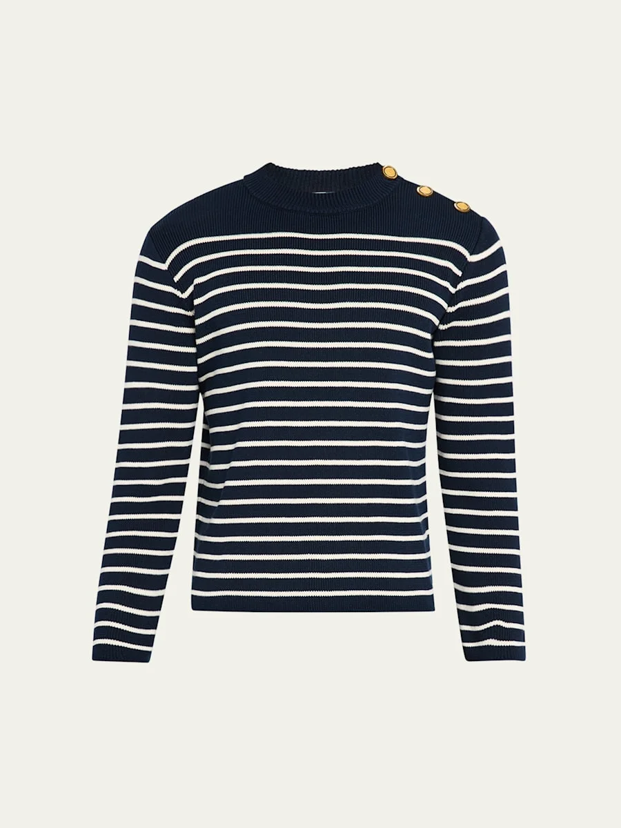 Valentino Garavani sweater in sailor stripes Branded gold-tone button detail at left shoulder Crew neckline Long sleeves Pullover style Wool Made in Italy Online Inquiries: BGS21_NCJ0J| Store Inquiries: #4888993