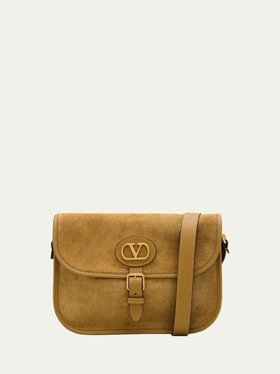 This Valentino Garavani crossbody bag is crafted of smooth suede with grain leather trim and signature VLogo accent in goldtone metal Adjustable leather crossbody strap, 21.7" drop Flap top with magnet and strap closure Interior, one zip pocket, two card slots Approx. 7.9"H x 9.8"W x 2.4"D Made in Italy
