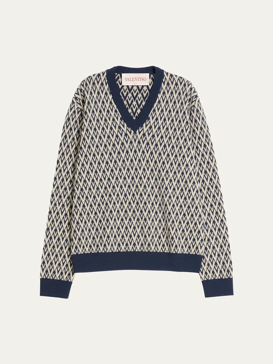 Valentino Garavani sweater in V patterned jacquard V-Neck Long sleeves Ribbed trim Pullover style Virgin wool Made in Italy Model is 6'1"/185cm. Online Inquiries: BGS21_NCHY7| Store Inquiries: #4888676