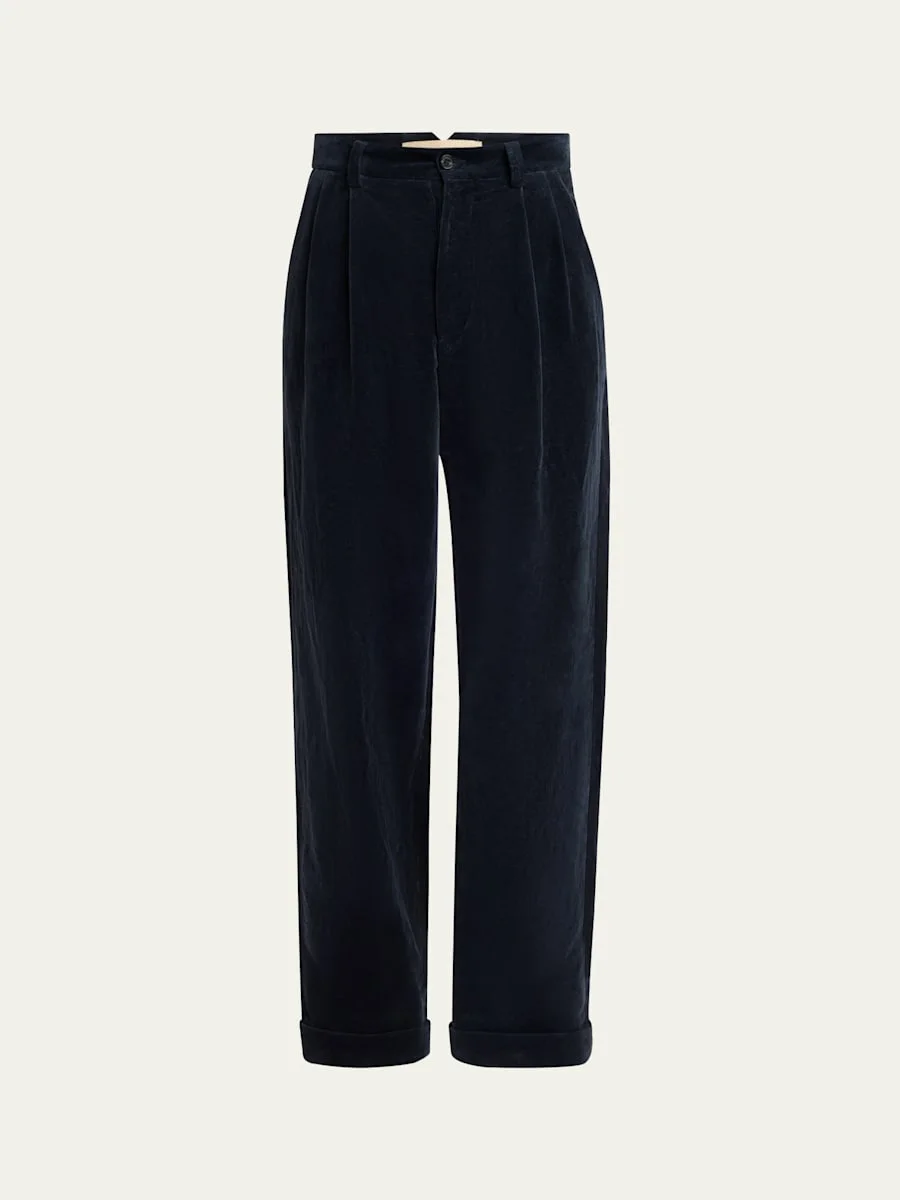 Valentino Garavani pants in soft velvet for an opulent finish High rise Double-pleated front Side slip pockets Button back besom pockets Classic fit through straight legs Full length Button-zip front; belt loops Cotton/flax Made in Italy Online Inquiries: BGS21_ND2AQ| Store Inquiries: #5000907