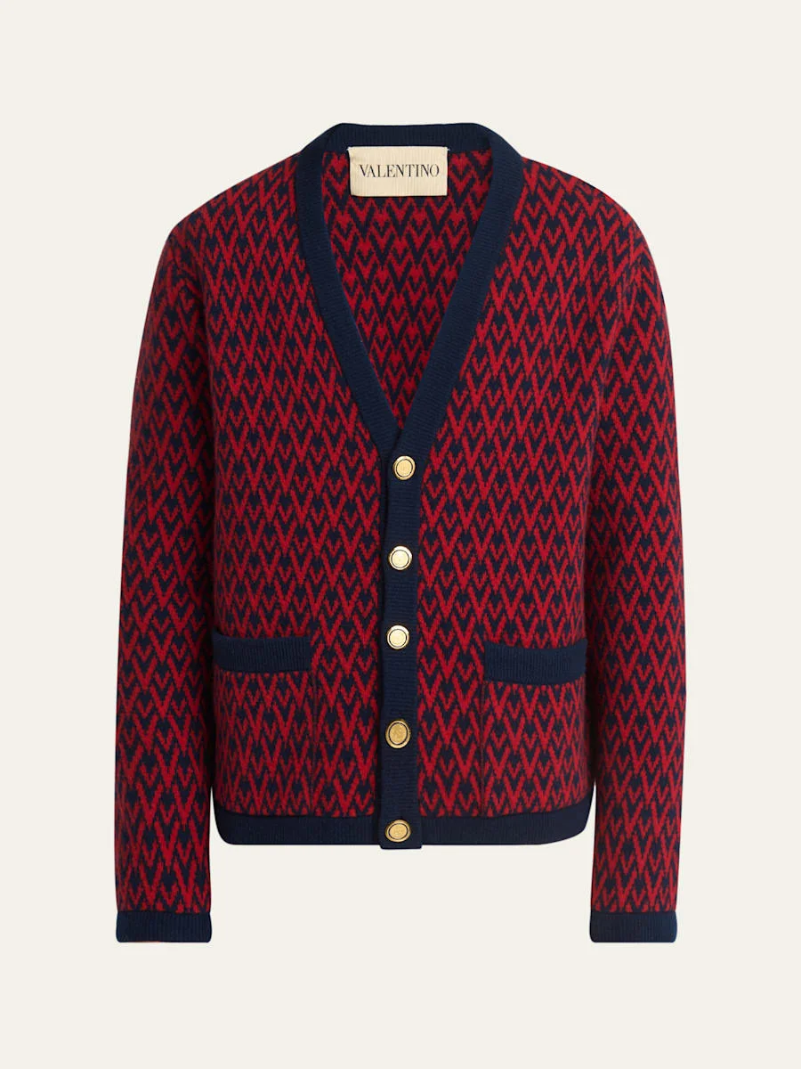 Valentino Garavani cardigan in wool knit with an elegant Toute La V jacquard pattern V-neckline Button front Hip patch pockets Long sleeves Ribbed cuffs and hem Wool Made in Italy Online Inquiries: BGS21_ND2AH| Store Inquiries: #5000896