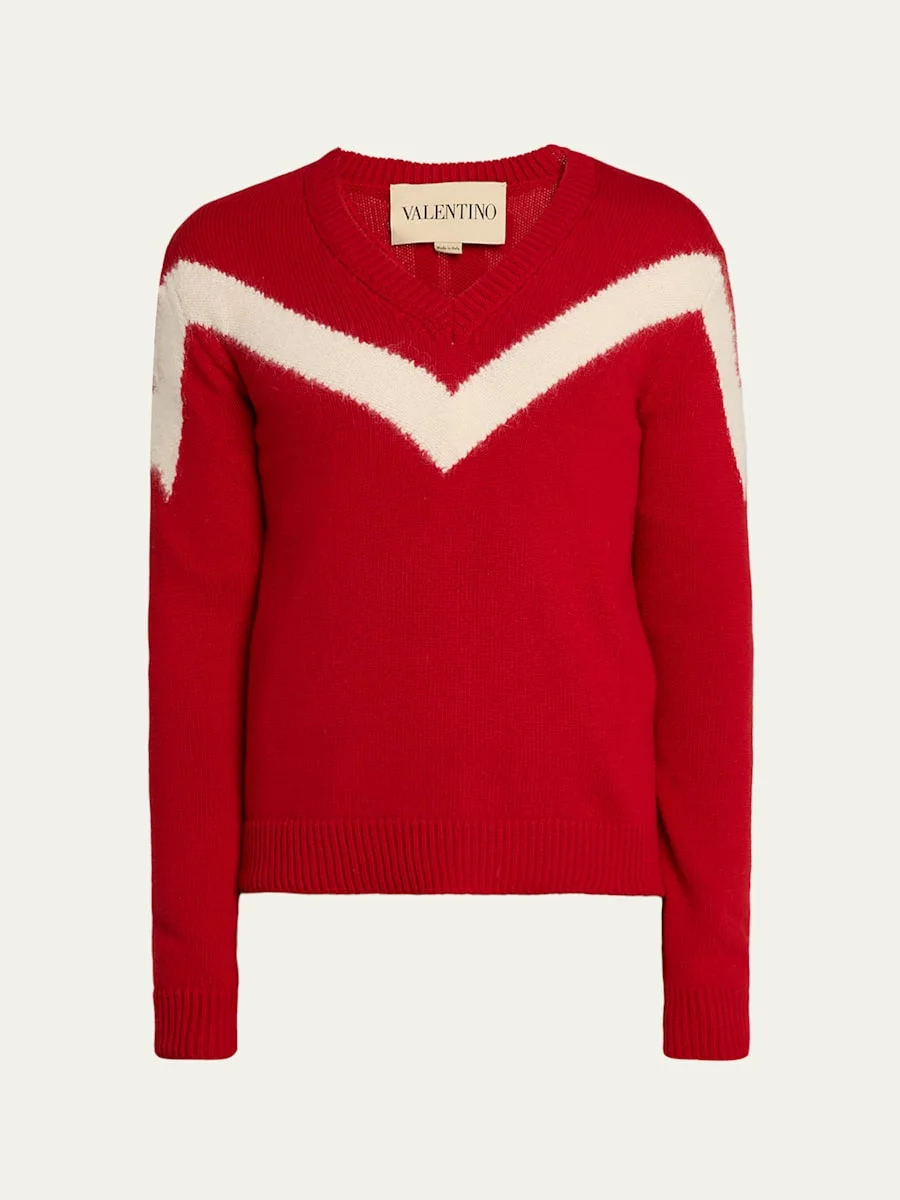 Valentino Garavani wool sweater displays the V motif on the chest and a selftie VLogo bow on the back, accented with small branded hardware 5 GG Vneckline Ribbed cuffs and hem Regular fit Pullover style Virgin wool Made in Italy