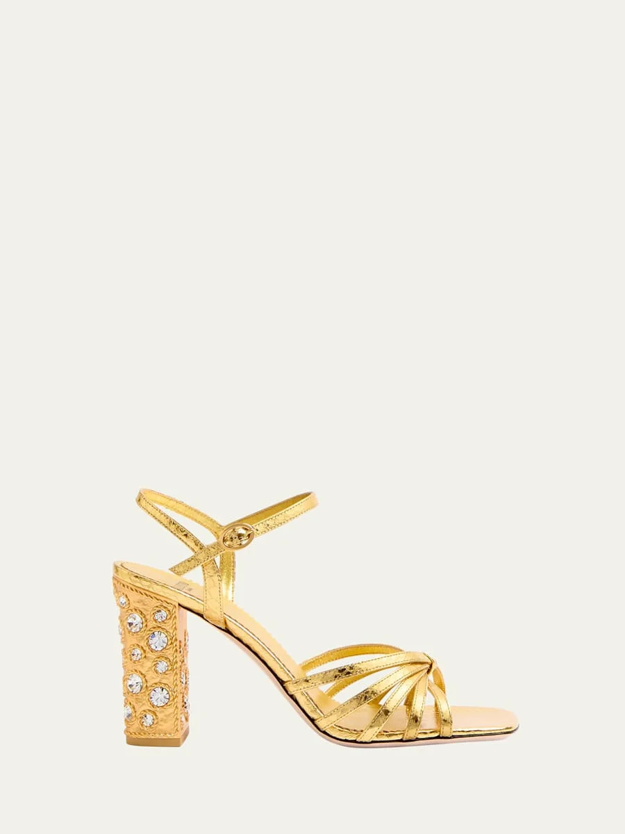 Valentino Garavani metallic python sandals with jewel trim 3.50 in / 90 mm embellished block heel Open toe Strappy crisscross vamp Adjustable ankle strap Leather outsole Lining: Leather Made in Italy Online Inquiries: BGS21_X6QQ2| Store Inquiries: #4888917