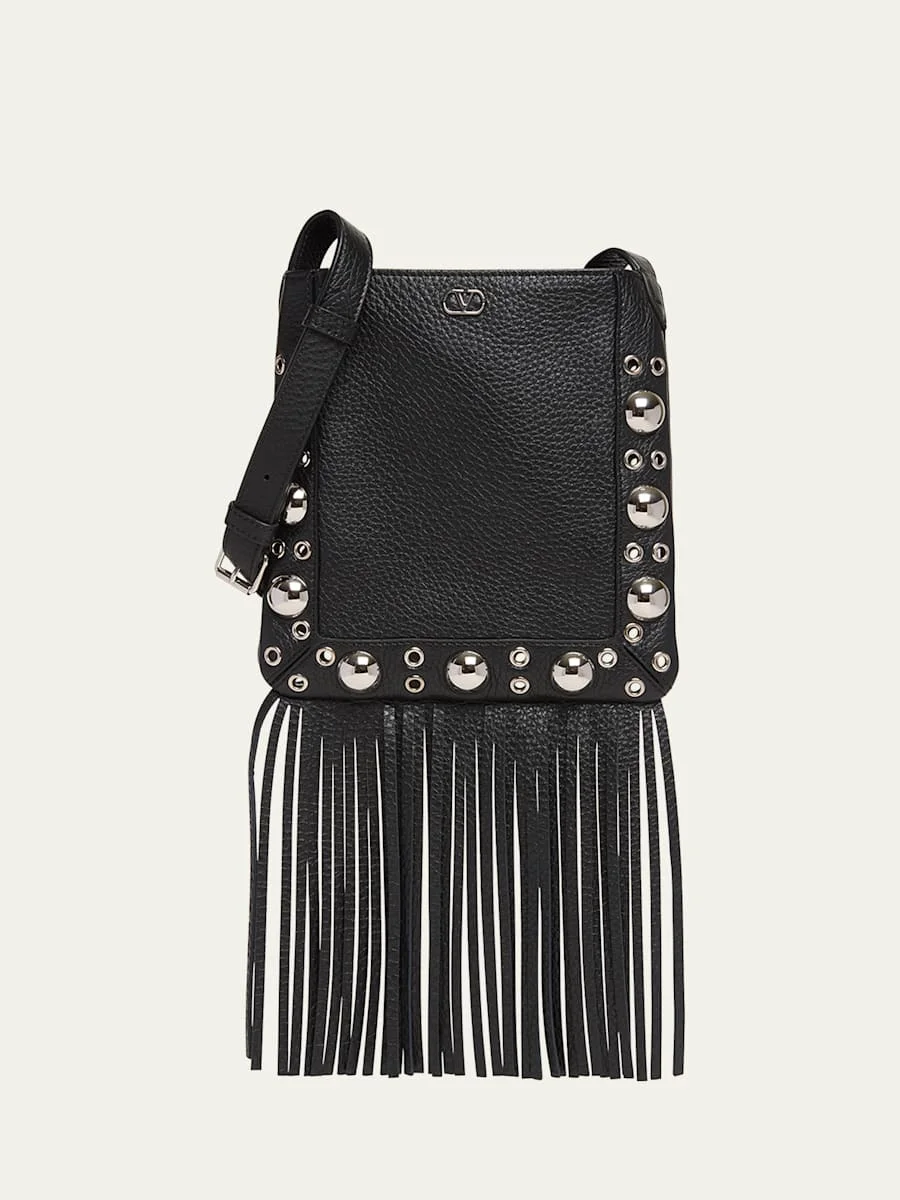 Valentino Garavani "Nellcote" leather crossbody bag with studs and fringe trim Features signature VLOGO hardware Adjustable crossbody strap Open top Approx. 7.9"H x 7.9"W x 1.2"D Made in Italy Online Inquiries: BGS21_V6F6R| Store Inquiries: #4957138
