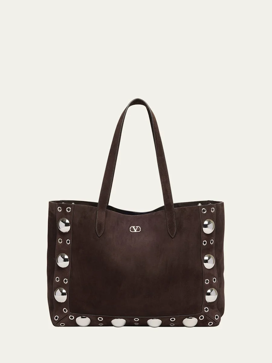 Valentino Garavani "Nellcote" suede tote bag with studded trim Features signature VLOGO accent Shoulder straps Open top Interior, leashed zip pouch bag Approx. 11.8"H x 15.7"W x 5.1"D Made in Italy Online Inquiries: BGS21_V6F7C| Store Inquiries: #4957160