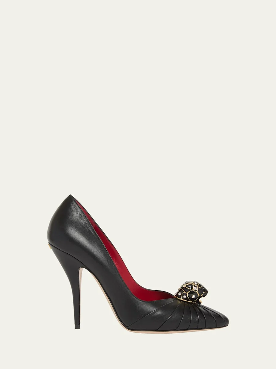 Valentino Garavani "Pas de Chat" leather pumps adorned with a crystal-embellished jaguar charm 4.25 in / 105 mm stiletto heel Pointed toe Slip-on style Leather outsole Lining: Leather Made in Italy Size Note: Valentino Garavani shoes run small. Please order a 1/2 size larger than you typically wear. Online Inquiries: BGS21_X6YG9| Store Inquiries: #5057010