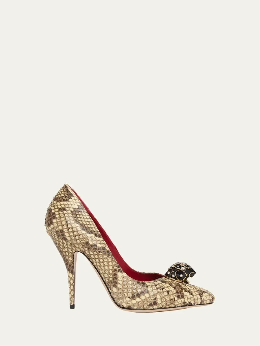 Valentino Garavani "Pas de Chat" pumps in python-printed leather 4.25 in / 105 mm stiletto heel Pointed toe Slip-on style Leather outsole Lining: Leather Made in Italy Size Note: Valentino Garavani shoes run small. Please order a 1/2 size larger than you typically wear. Online Inquiries: BGS21_X6YGA| Store Inquiries: #5057011