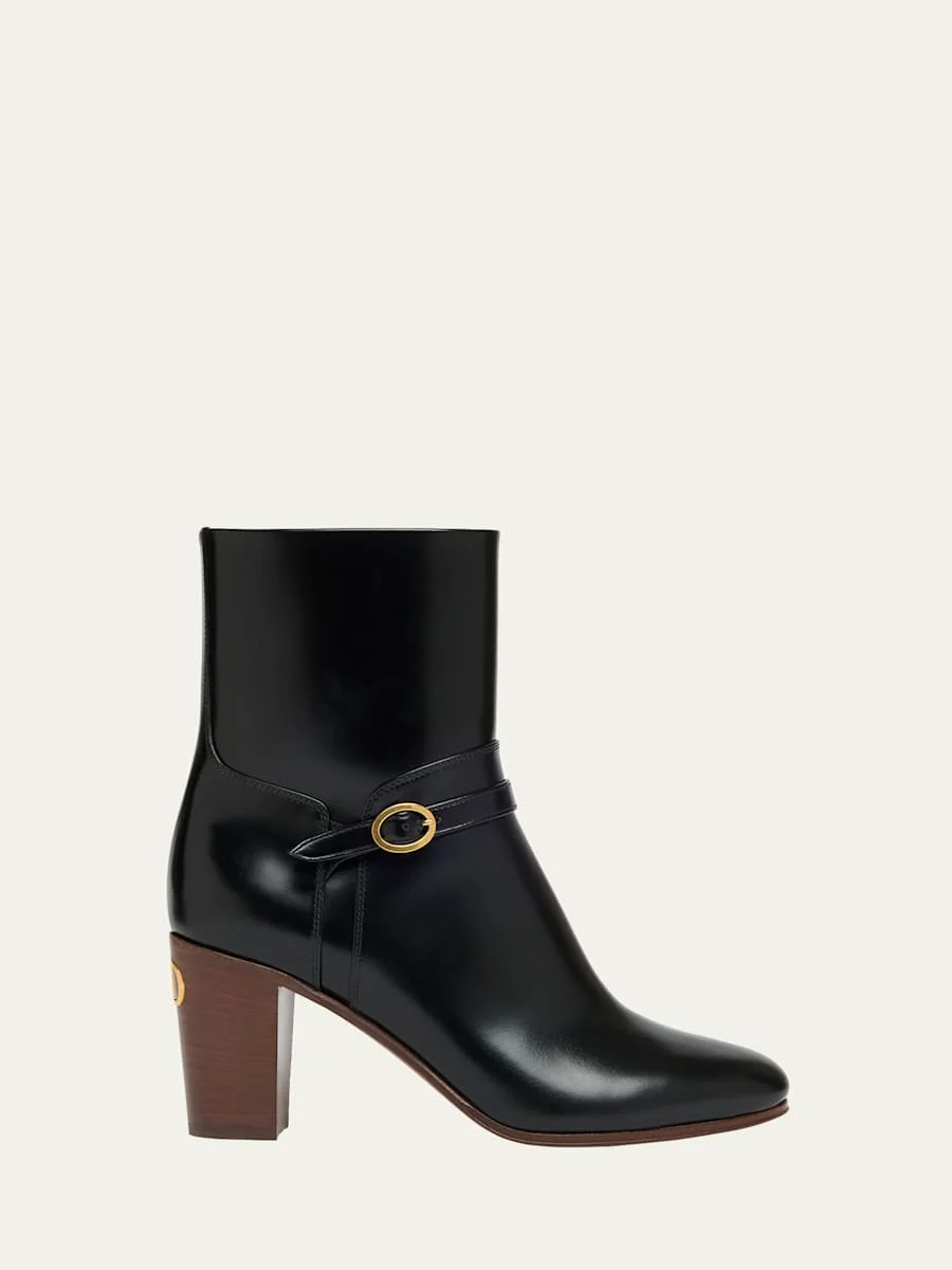 Valentino Garavani "Pattie" sleek calf leather ankle boots with delicate buckle strap accent 3.00 in / 75 mm block heel Round toe Side zip eases dress Lining: Leather Leather outsole Made in Italy Online Inquiries: BGS21_X6VLM| Store Inquiries: #4994769