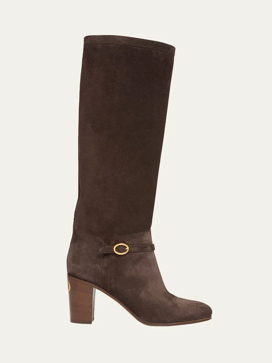 Valentino Garavani "Pattie" soft calf suede knee boots with delicate buckle strap accent 3.00 in / 75 mm block heel Round toe Pullon style Lining: Leather Leather outsole Made in Italy