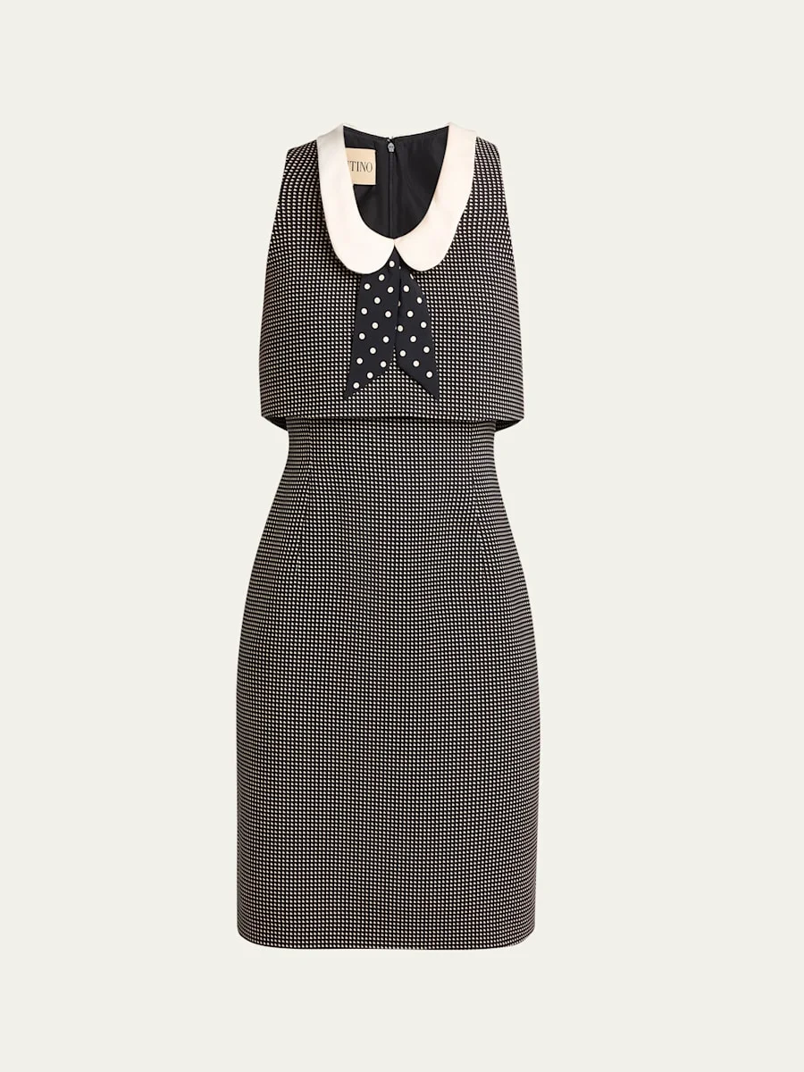 Valentino Garavani dress is crafted from heart printed wool crepe accented with a contrast collar, polkadot silk scarf, and a tiered bodice Peter Pan collar Sleeveless Sheath silhouette Knee length Invisible back zip Virgin wool/silk Made in Italy