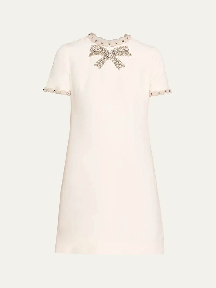 Valentino Garavani mini dress with contrast crystal-embellished puff trim and front crystal bow applique Jewel neckline Short sleeves Hem falls above the knee A-line silhouette Invisible back zipper Virgin wool/silk Made in Italy Online Inquiries: BGS21_B9XT2| Store Inquiries: #4996672