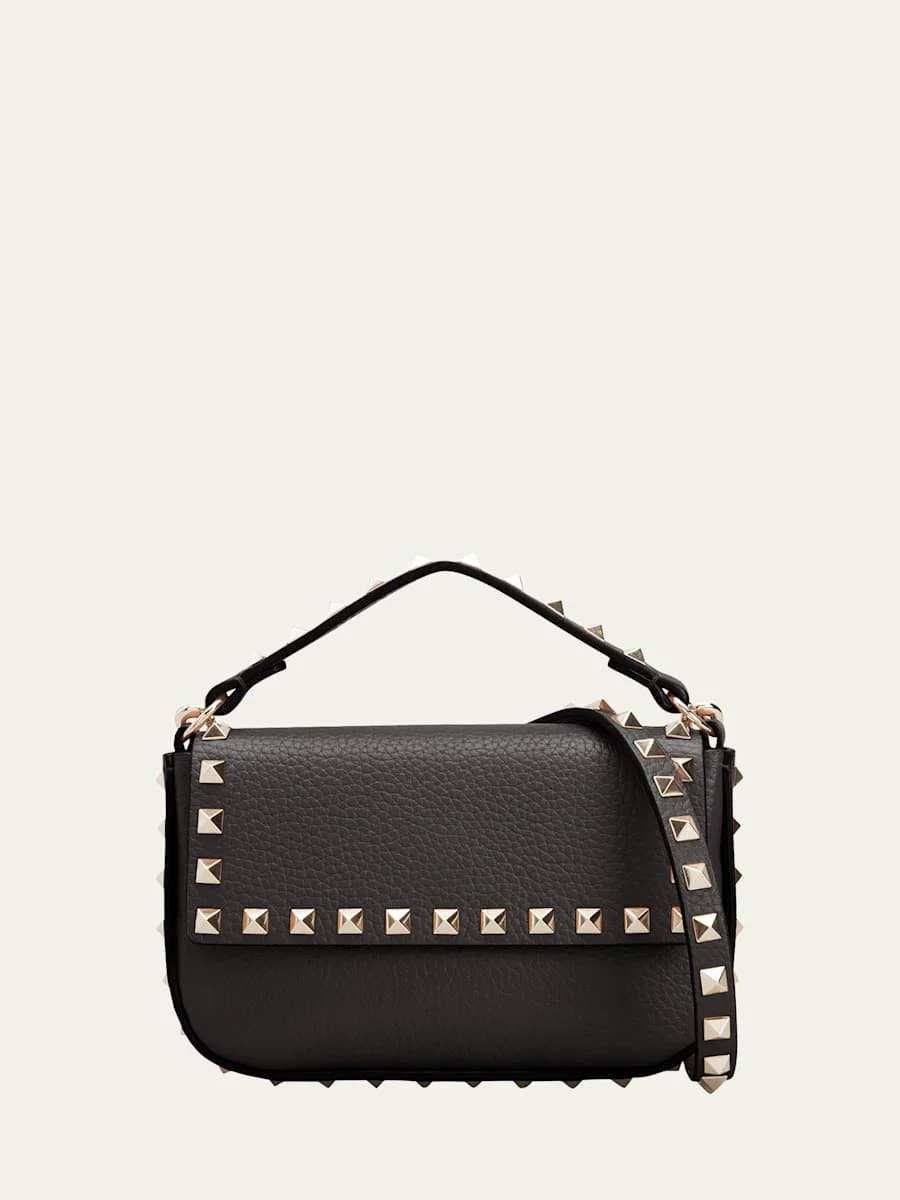 Valentino Garavani shoulder bag in pebbled calf leather. Signature Rockstud trim. Flat top handle anchored by metal rings. Adjustable shoulder strap. Flap top with push-lock closure. Interior, slip pockets. 4.7"H x 0.79"W x 7.09"D. Made in Italy. Online Inquiries: BGS21_V5NRK| Store Inquiries: #4037245