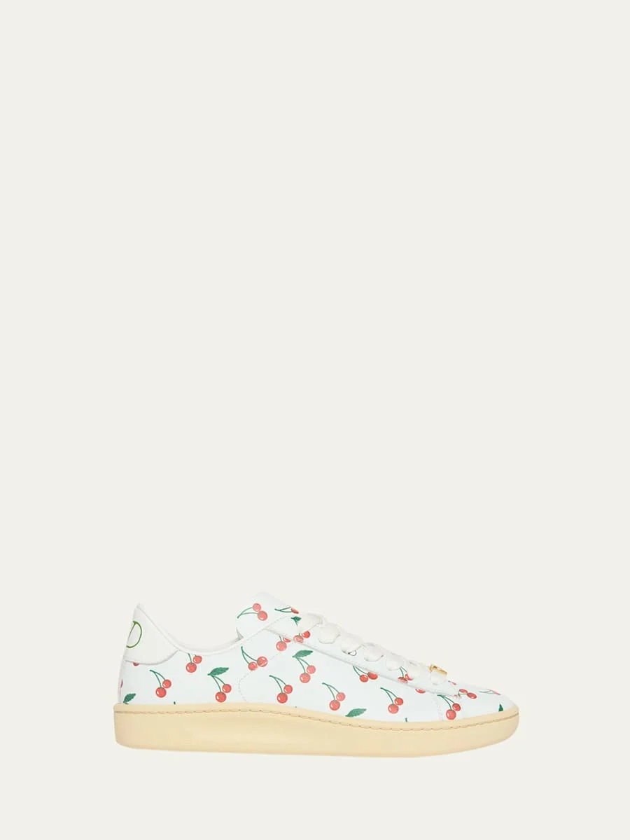 Valentino Garavani "Royco" sneakers in soft napa leather with allover cherry print Flat heel Round toe Laceup vamp Goldtone metal VLogo hardware VLogo print on back collar Leather lining and outsole Made in Italy