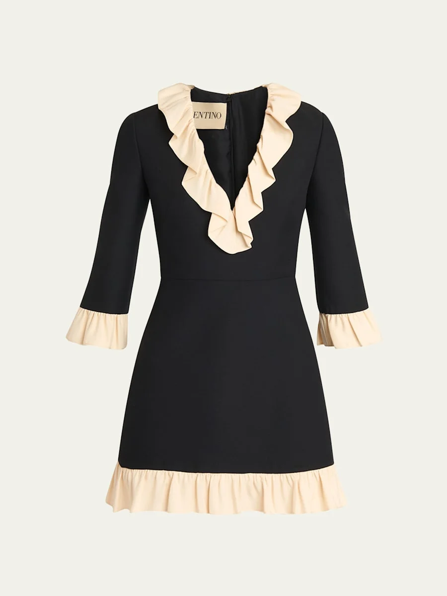 Valentino Garavani dress adorned with contrast silk ruffles along the neck, cuffs, and hem V neckline 3/4 sleeves Mid-thigh length A-line silhouette Invisible back zip Virgin wool/silk Lining: Silk Made in Italy Online Inquiries: BGS21_B9XPE| Store Inquiries: #4995748