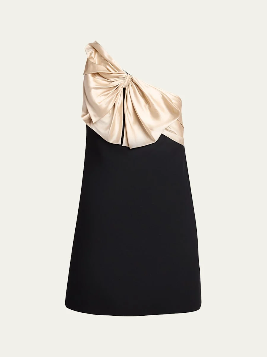 Valentino Garavani dress is crafted of a wool crepe featuring a contrast satin bow draped across the neckline One-shoulder neckline Sleeveless A-line silhouette Mini length Side zip Virgin wool/silk Made in Italy Online Inquiries: BGS21_BAZW8| Store Inquiries: #5359748
