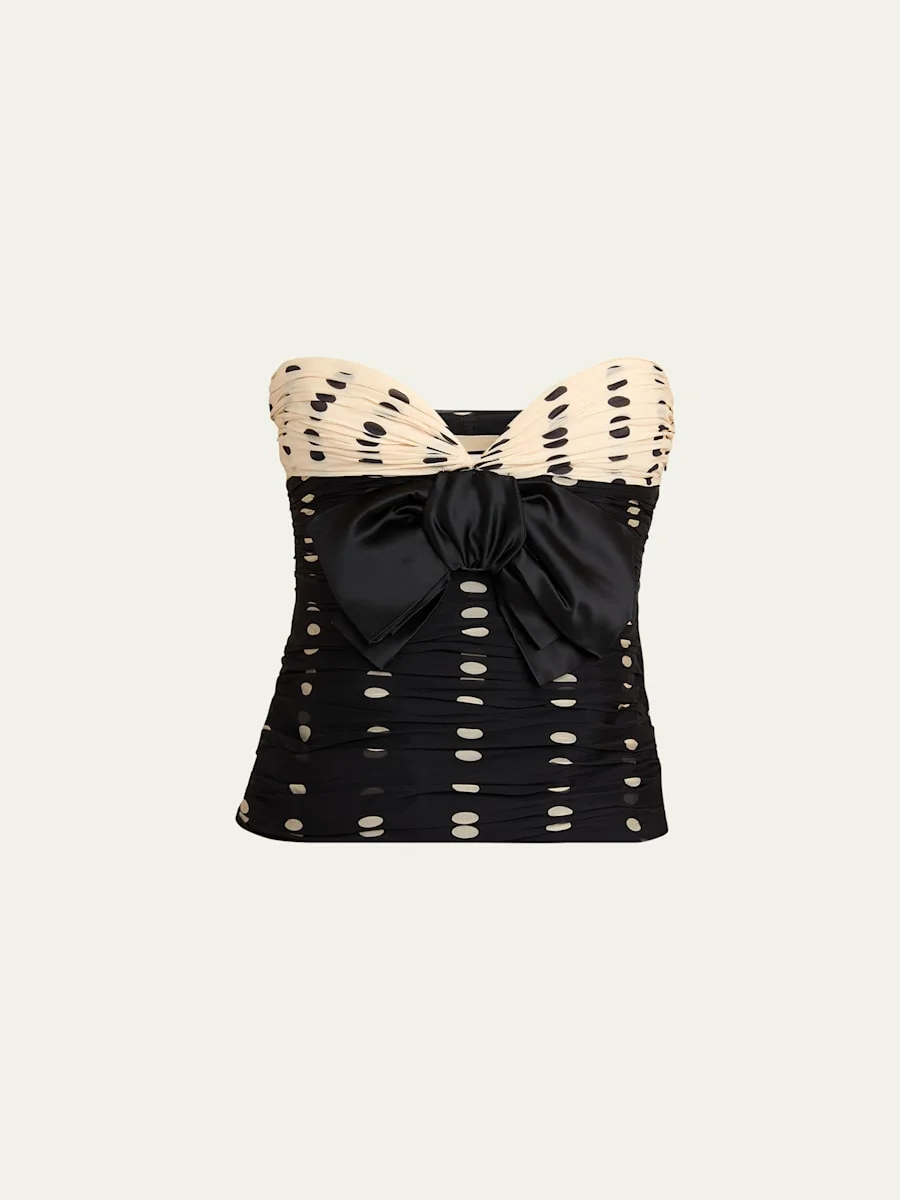 Valentino Garavani ruched polka dot bustier with a satin bow detail Sweetheart strapless neckline Sleeveless Fitted Silk Elastane/viscose lining Made in Italy Online Inquiries: BGS21_B9SPM| Store Inquiries: #4957878