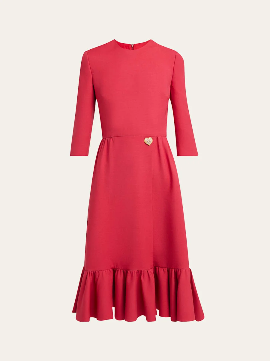 Valentino Garavani dress in crepe couture with a strass heart attached to the left hip Jewel neckline Three-quarter sleeves Ruched skirt Flounce ruffle hem Hem hits around the knee A-line silhouette Invisible back zipper Virgin wool/silk Made in Italy Online Inquiries: BGS21_B9XTL| Store Inquiries: #4996680