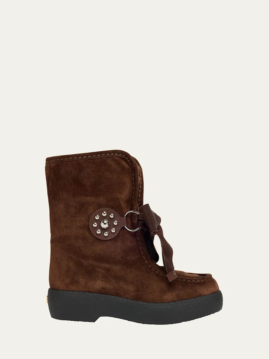 Valentino Garavani suede snow booties with faux fur (polyester/wool) lining 2.25 in / 55 mm block heel Round moc toe Selftie vamp with stud embellishment Vlogo on the back of the midsole Rubber outsole Made in Italy