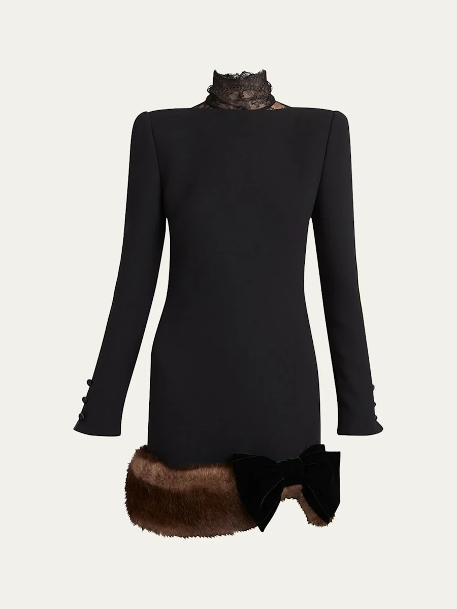 Valentino Garavani dress crafted in rich virgin wool crepe featuring a lace collar inset and trimmed with dyed sheep shearling (Italy) at the hem with a velvet bow for an elevated drama Turtleneck Long sleeves; button cuffs Padded shoulders Sheath silhouette Mid-thigh length Back zip Virgin wool/shearling Made in Italy Online Inquiries: BGS21_BA9C4| Store Inquiries: #5060273