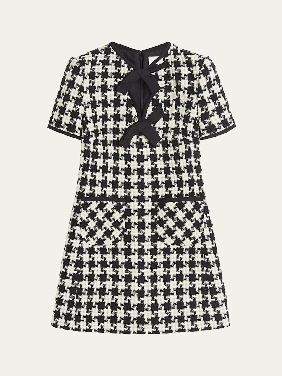 Valentino Garavani tweed dress in houndstooth motif with bow detail Round neckline; keyhole front Short sleeves Short length Mini length Back zip Acrylic/virgin wool/cotton Made in Italy Model is 5'10"/177cm. Online Inquiries: BGS21_B9KGQ| Store Inquiries: #4892831