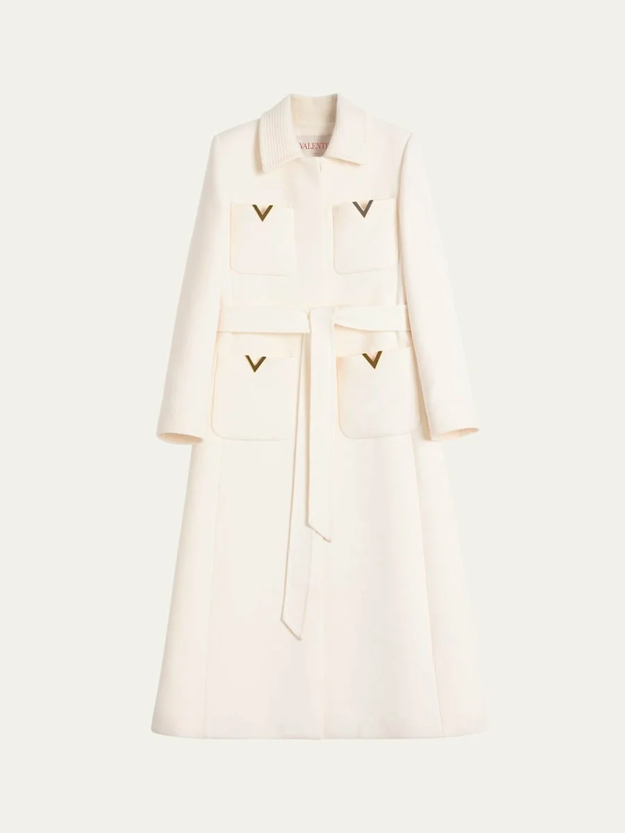 Valentino Garavani coat features V logo hardware Spread collar; concealed placket Long sleeves Four patch pockets Self-tie waist A-line silhouette Virgin wool/silk Made in Italy Model is 5'10"/177cm. Online Inquiries: BGS21_B9KHQ| Store Inquiries: #4892867