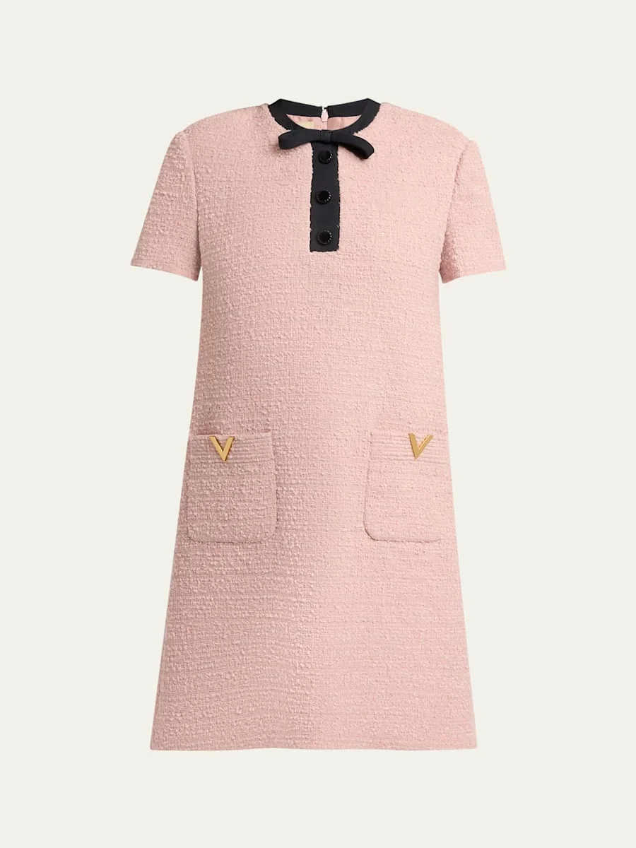 Valentino Garavani dress is crafted of boucle tweed featuring signature goldtone V logo pockets and crepe neck trim with a bow Round neckline; threebutton front Short sleeves Front patch pockets Shift silhouette Mini length Invisible back zip Virgin wool/nylon/polyamide Made in Italy