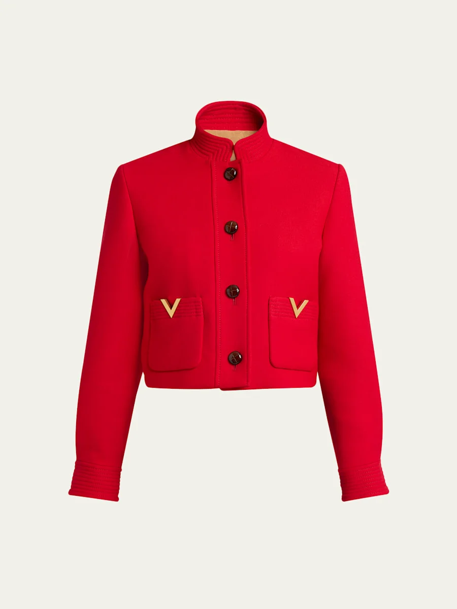Valentino Garavani peacoat is crafted of a woolblend twill featuring signature goldtone Vlogo details and topstitched edges Mandarin collar; singlebreasted front Long sleeves; button cuffs Hip patch pockets Straight fit Hip length Virgin wool/silk Made in Italy