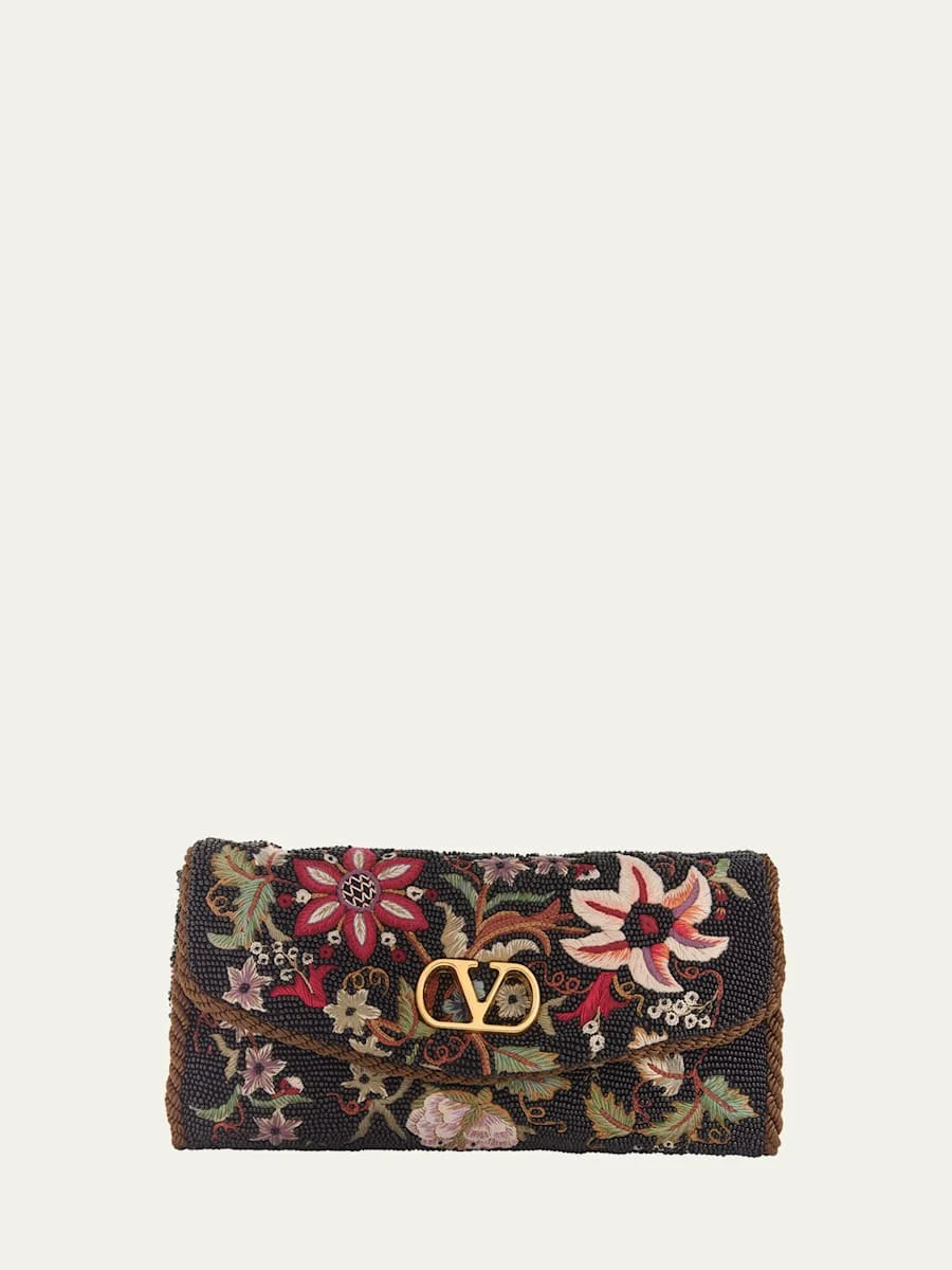 Valentino Garavani "Vain" clutch bag in floral beaded fabric Features signature VLOGO accent Adjustable shoulder strap Can be worn as a clutch or shoulder bag Envelope flap top with magnetic closure Approx. 4.7"H x 9.3"W x 1.2"D Leather/silk Made in Italy Online Inquiries: BGS21_V6HH8| Store Inquiries: #4996768