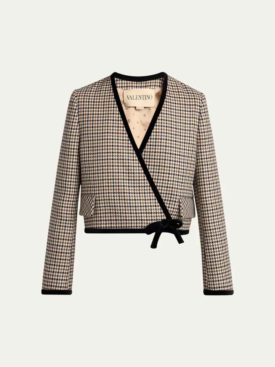Valentino Garavani wrap jacket is crafted of a wool houndstooth check adorned with velvet trim V neckline Long sleeves; button cuffs Padded shoulders Hip flap pockets Straight fit Cropped length Selftie side closure Virgin wool Made in Italy